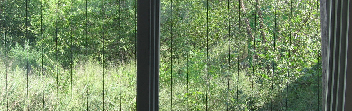 Place physical barriers like screens, netting, hanging cords, or scrims in front of the glass. As long as the physical barriers do not contain open spaces that are larger than 2 x 2 inches, or the hanging cords are spaced no wider than 4 inches apart, they can effectively discourage most birds from trying to fly through them into the glass.
